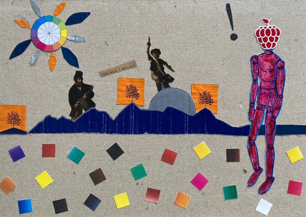 « Au pays de la couleur, Tostado et Molido se battent contre le Grand Framboiseur Jean-Auguste Dominique », Collage sur papier, 21 x 30 cm, 2020