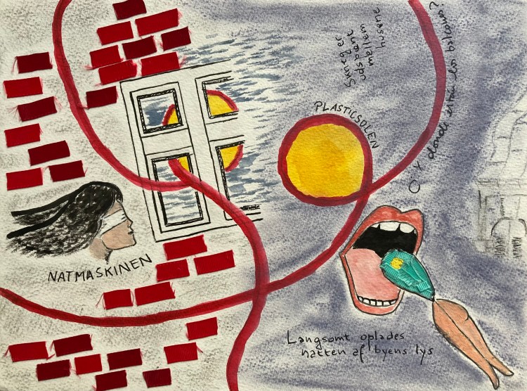 « Copenhague », Acrylique, aquarelle, crayon, feutre et collage sur papier, 24 x 32 cm, 2019