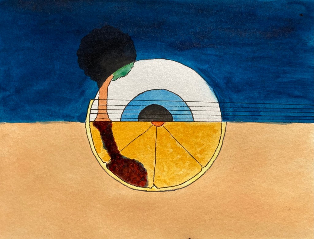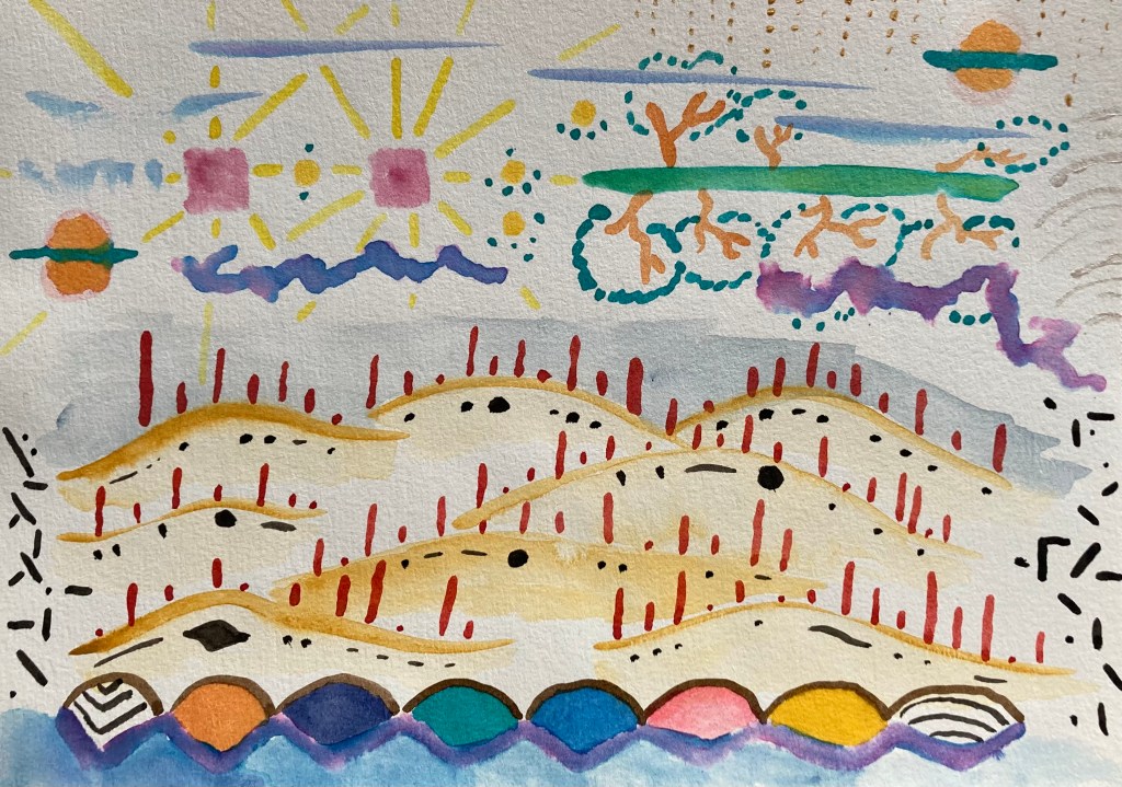 « Demain de l’après-minuit », Aquarelle et feutre sur papier, 15 x 21 cm, 2019