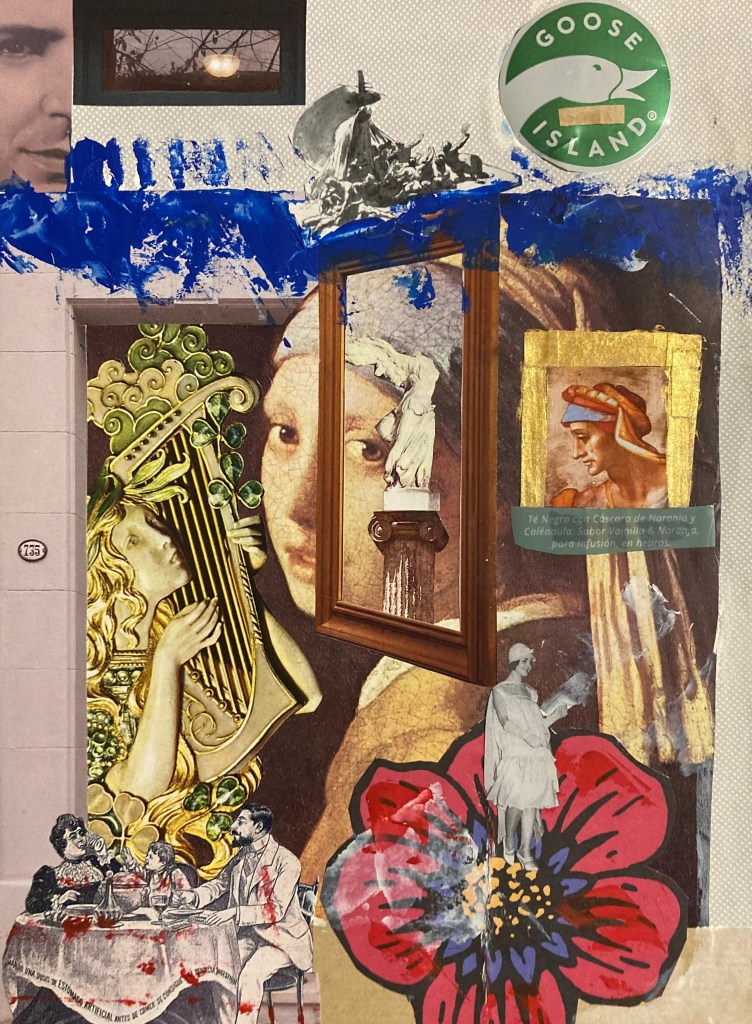 « Un samedi soir a Goose Island », Collage et acrylique sur papier, 28,7 x 22 cm, 2021